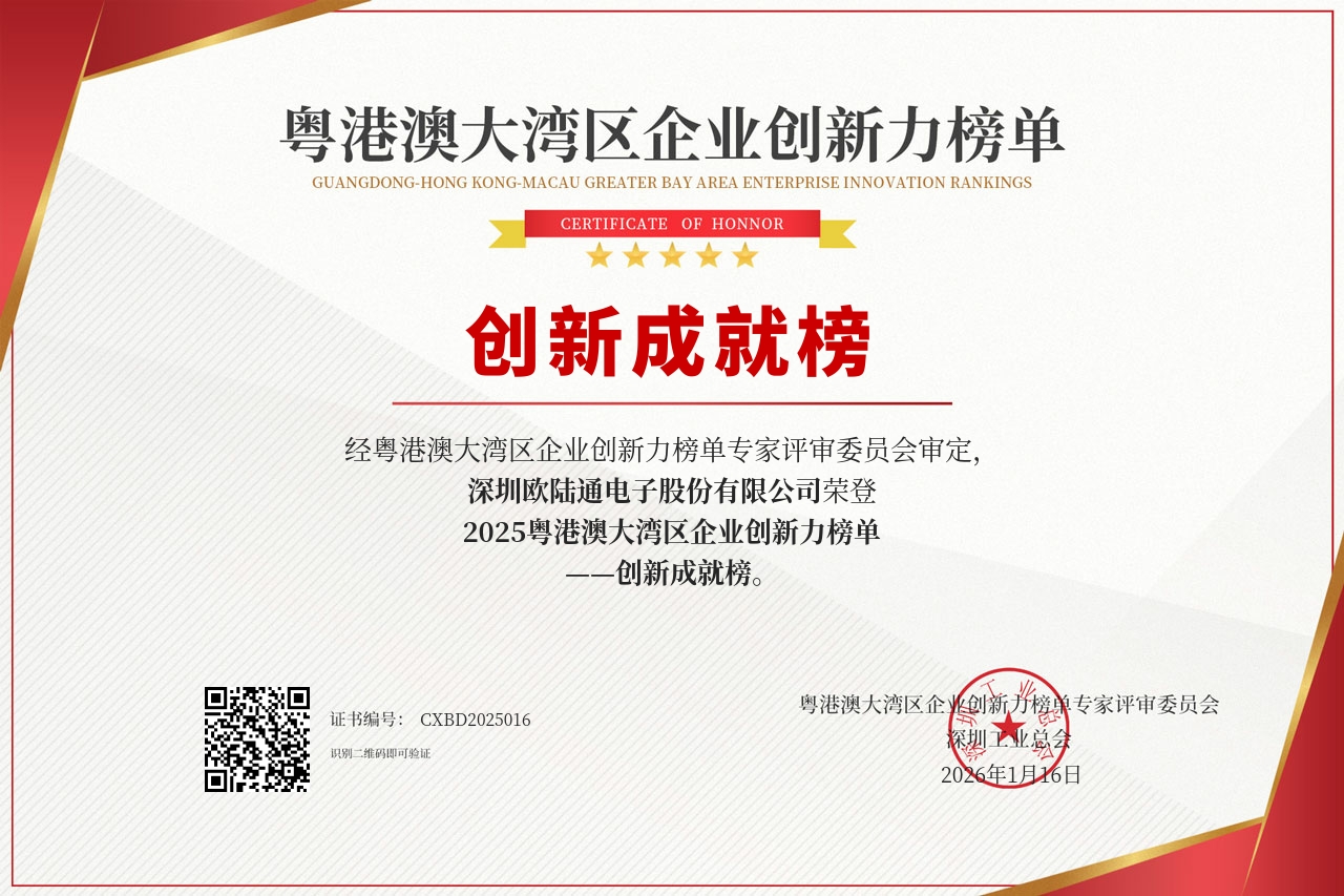 凭借着卓越的自主创新能力和显著的市场表现,欧陆通已连续六年蝉联“粤港澳大湾区企业创新力榜单——创新成就榜”,公司副董事长王越天先生再度入选“粤港澳大湾区企业创新力榜单——创新杰出人物榜”。
