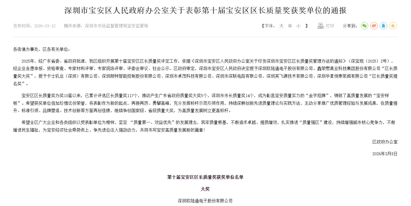 近日,深圳市宝安区人民政府正式发布表彰通告,欧陆通凭借卓越的综合管理实力,成功斩获“第十届宝安区区长质量奖大奖”。这份荣誉的背后,是欧陆通近三十年来深耕实业的积淀,更是政府及行业对企业综合实力的高度肯定。
